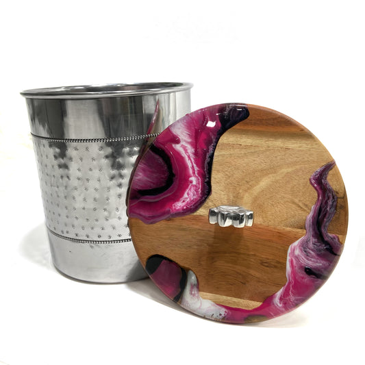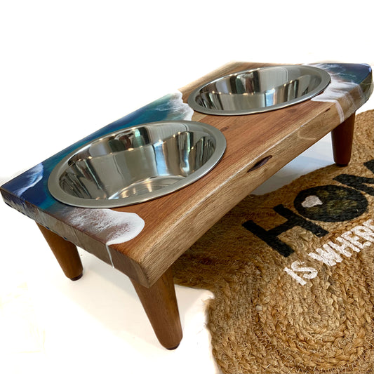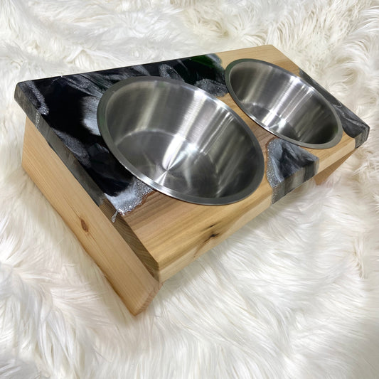 Marble-Style Dog Bowl Stand - Poplar Wood with Black & Silver Resin Art